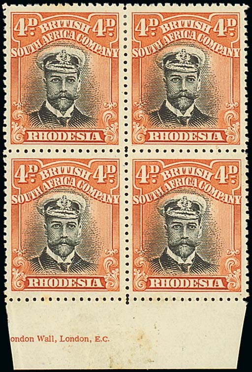 Black and orange-red block of four from the foot of the sheet with part imprint, fresh mint with a couple of hinge remainders. A scarce multiple. Photo