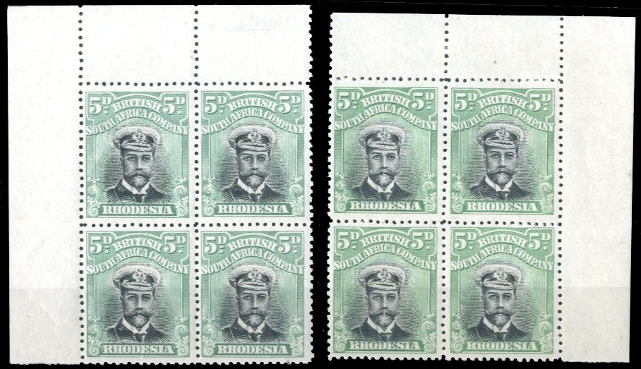 Black and grey-green upper left corner block of four and black and bright green upper right corner block of four with manuscript "LW 28/8/19" on reverse of margin, fresh mint with the first unmounted, a fine and most attractive pair. S.G. 226, 227