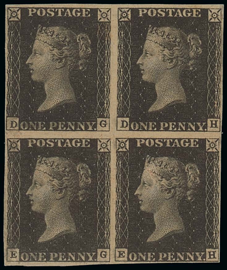 DG-EH block of four, good to large margins all round with full original gum; part old hinge remainder and a couple of vertical gum wrinkles which have caused some tiny patches of gum rubbing. A fresh and appealing block, and unusual to find one so fine. A delight to grace even the finest of collections or exhibits. B.P.A. Certificate (2007). Cat. £185,000. Photo