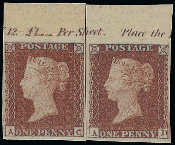 Plate 121, AC, AD 'pair' in very deep red-brown (almost purple-brown), with top margins showing part of the inscription, large to very large margins. Fresh and attractive. Photo
