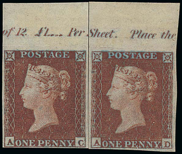 Plate 185, AC, AD 'pair' in a dark red-brown, with top margin showing inscription, other margins close to very large; heavily blued paper showing a distinctive ivory head. Fresh and fine. Photo