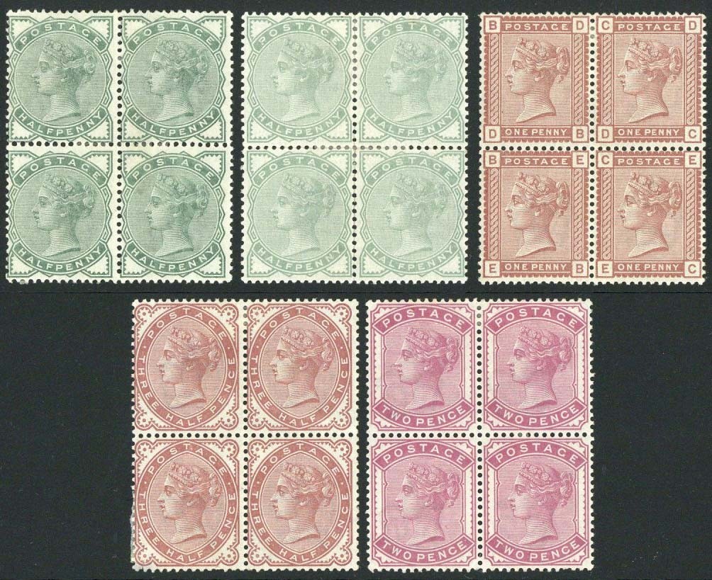 ½d. (both shades) to 2d. deep rose in blocks of four, part to large part original gum; one ½d. block with split perfs. and 1½d. block is creased. Good appearance. Photo
