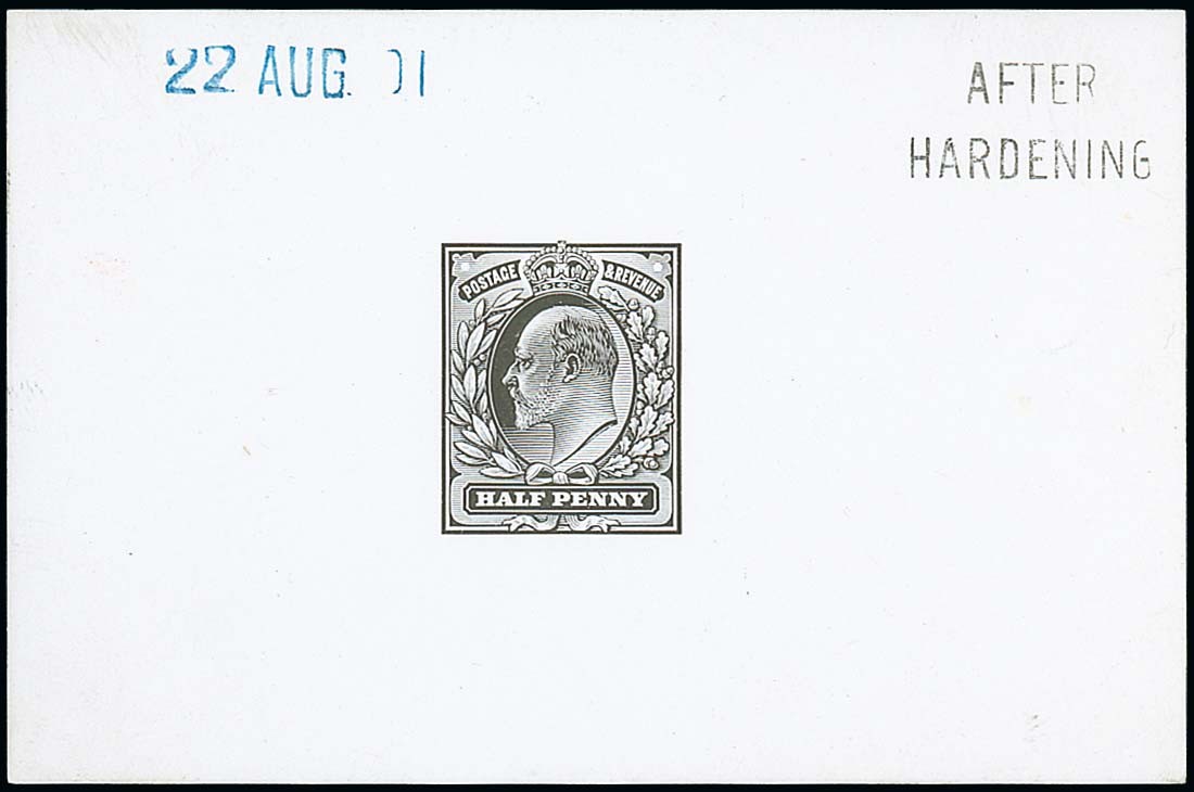 ½d. die proof in black on glazed card (92x60mm) dated "22 AUG 01" in blue and stamped "after/hardening"; hinge remainders on the reverse, very fresh and fine. Cat. £2500. Photo