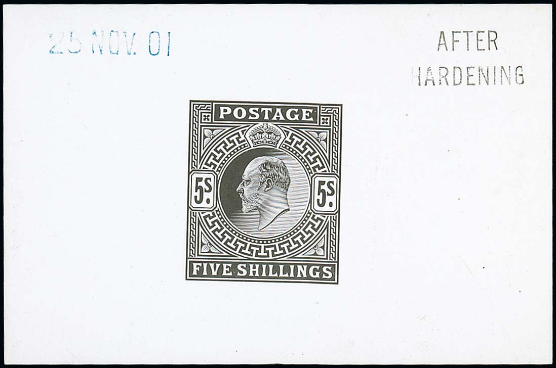 5/- die proof in black on glazed card (92x60mm) dated "25 NOV. 01" in blue and stamped "before/hardening"; hinge remainders on the reverse, fresh and fine. Cat. £3500. Photo