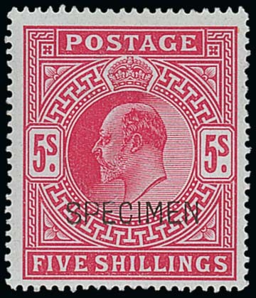 5/- bright carmine overprinted "specimen" type 16, large part original gum; trivial gum bend. Fresh. S.G M51s, £380. Photo