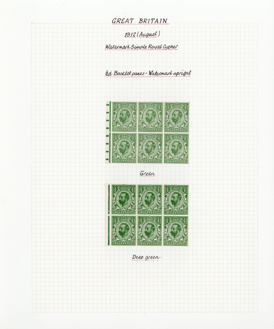 — ½d. booklet panes of six in green and deep green shades plus two panes showing variety cracked frame below "PE" (two panes), large part original gum; mixed perfs., fair to fine. (4 panes)