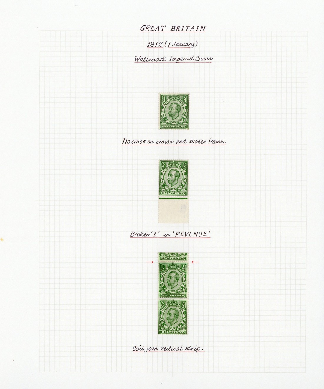 Die 2, Watermark Crown: ½d. green, a small group with no cross on crown, broken "E" in "REVENUE" and coil join with a fragment of one of the stamps, large part original gum
