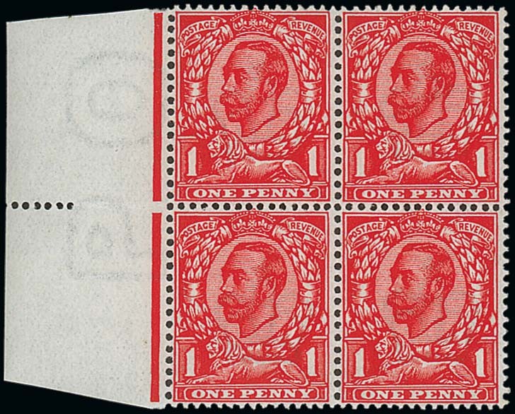— 1d. very deep bright scarlet in a left margin block of four, unmounted mint; a couple of minor gum bends. A splendid block. S.G. N11 (4), £1100+. Photo