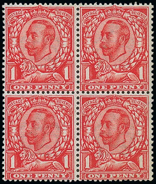 — 1d. aniline scarlet in a block of four, one stamp with variety no cross on crown, unmounted mint. R.P.S. Certificate (1972). S.G. N11 (5)b. Photo