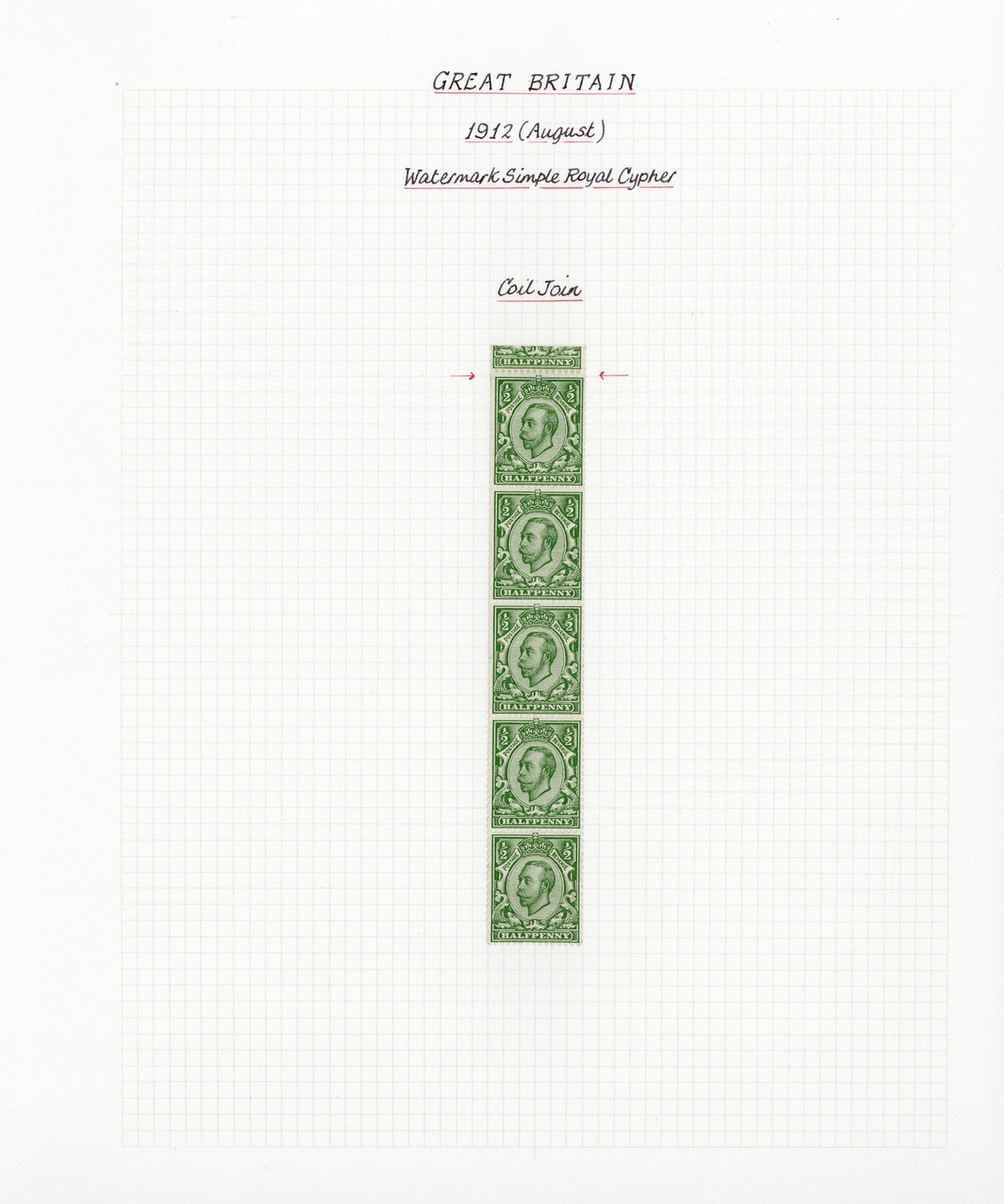 — ½d. green coil join pair in a vertical strip of six, large part original gum; also ½d. Royal Cypher coil join (top stamp reduced to a fraction). S.G. N6i