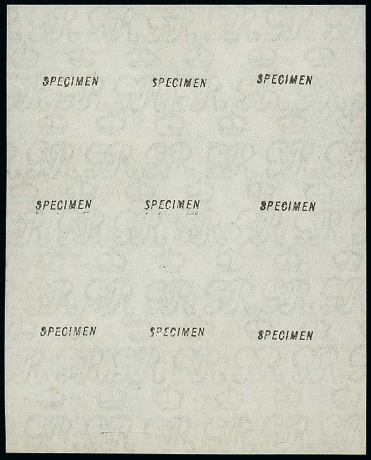 Paper trial of multiple Royal cypher watermarked paper handstamped "specimen type 23 on gummed paper, a block of nine from the foot of the "sheet"; a couple of gum bends. Photo
