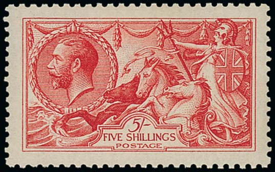 5/- carmine-red, large part original gum; a couple of internal gum bends, very well centred and good perfs. Attractive. S.G. N66 (3), £700. Photo