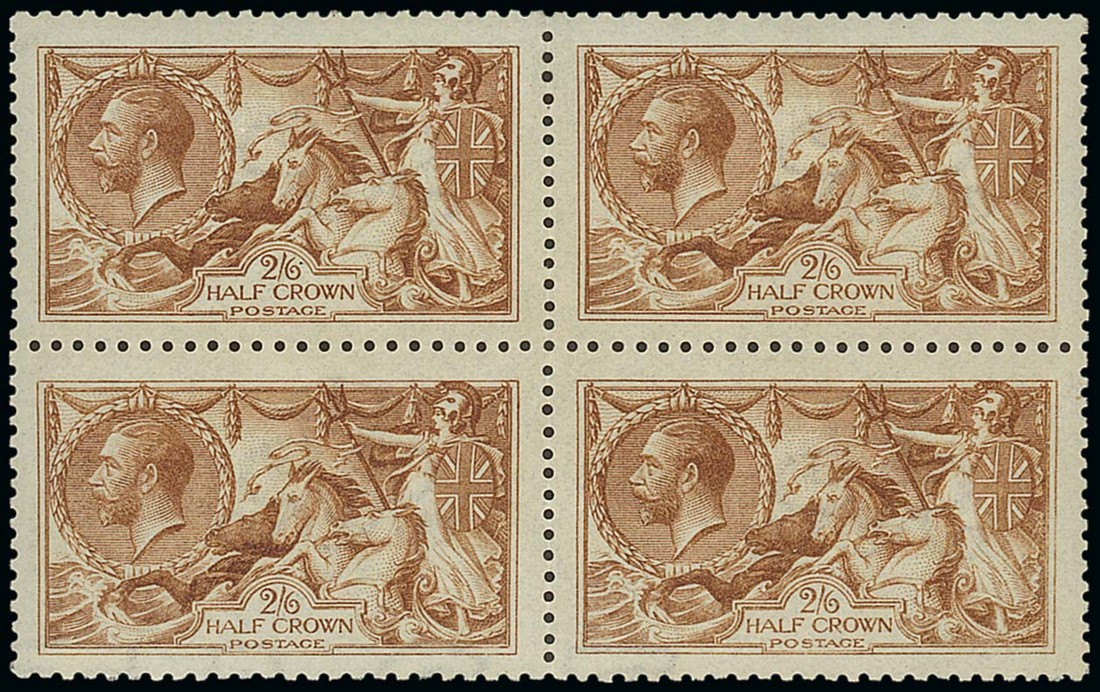 2/6d. cinnamon-brown in a block of four, lightly mounted mint or unmounted mint, well centred and good perforations. From the foot of the sheet and showing portions of the watermark letters. A very desirable and rare block of this shade. R.P.S. Certificate (1991). Photo