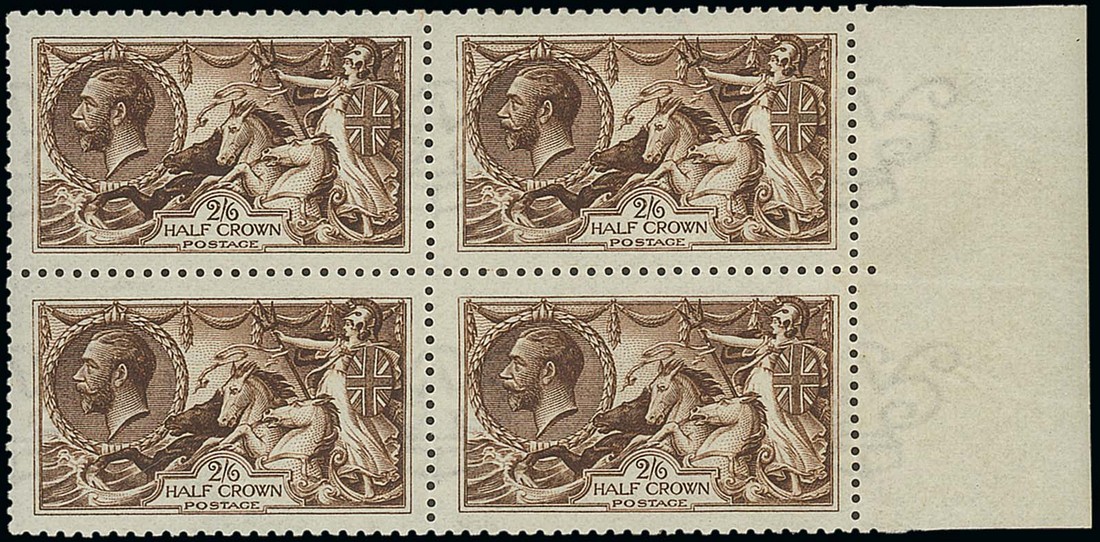 2/6d. very deep brown, variety inverted watermark in a right margin block of four, clearly showing the inverted watermark in the margin, lightly mounted mint, the lower pair unmounted; well centred with good perforations all round. A spectacular and important block of this error. S.G. N64 (11)f, £10,900. Photo