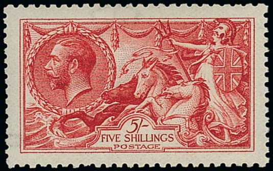 5/- bright carmine, lightly mounted mint, well centred and good perforations. Rich colour and a delightful example of this deeper shade. S.G. 409, £650. Photo