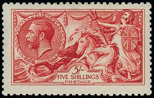 5/- bright carmine, mint; centred a little high and right. Fresh and strong colour. S.g. 409, £650. Photo