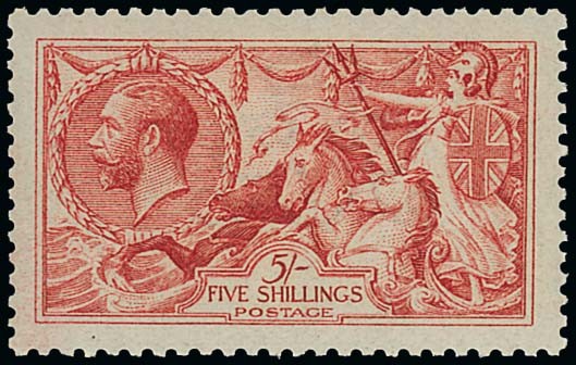 5/- carmine, large part original gum; well centred and with good perforations all round. A fine and attractive example of this intermediate shade. S.G. N67 (2), £500. Photo