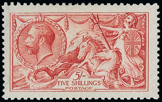 5/- pale carmine, large part original gum; centred a fraction left, choice perforations. Fine. S.G. 410, £600. Photo