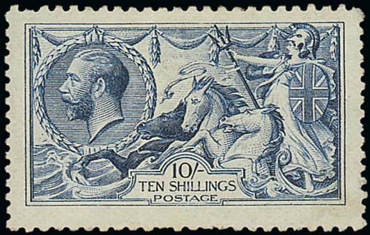 10/- deep blue, large part original gum; a few irregular perforations and a lightly bent corner perforation.S.G. 411, £3750. Photo