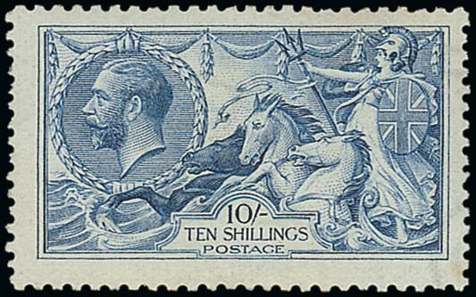 10/- pale blue, large part original gum; good and distinctive colour and perforations. S.G. 413, £3500. Photo