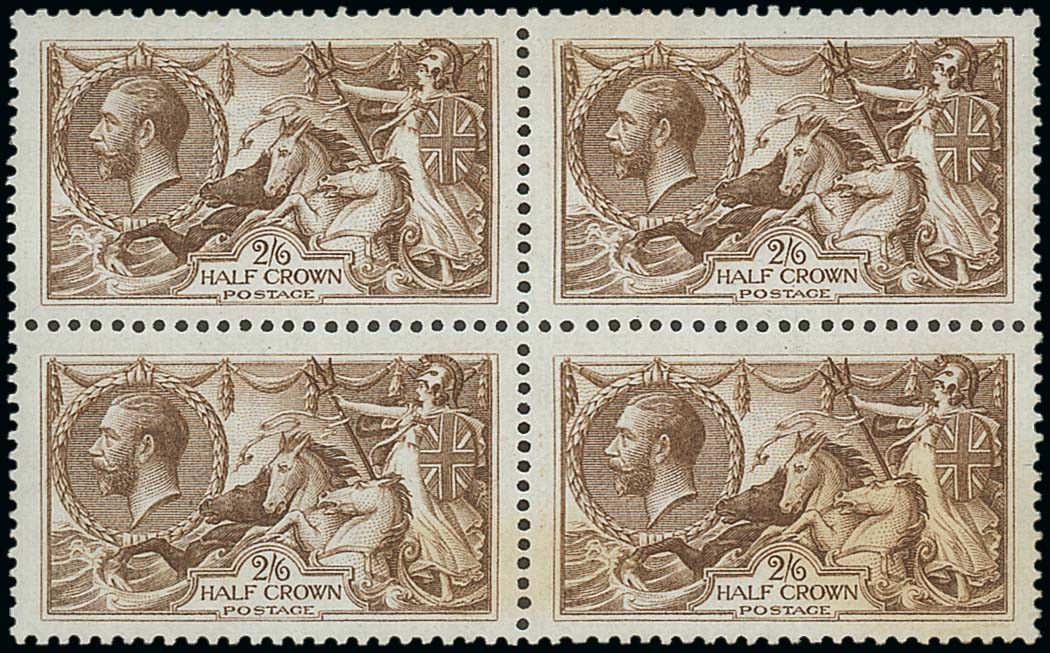 2/6d. olive-brown in a block of four, large part original gum; very well centred and with choice perforations, a couple of stained patches at foot which are evident from the front. S.G. 413a. Photo