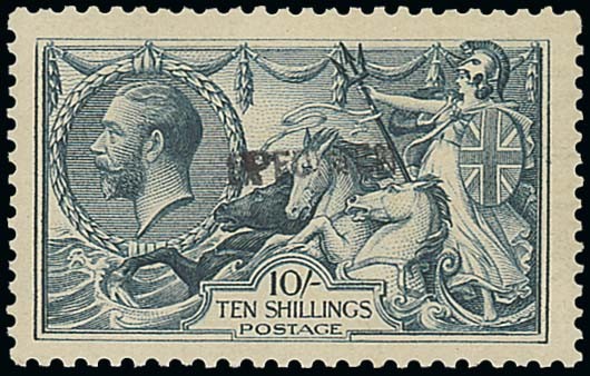 10/- dull grey-blue handstamped "specimen" type 31 in black, with full original gum; some light gum ageing. R.P.S. Certificate (1989). S.G. N71u, £1200. Photo