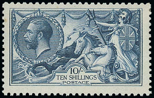 10/- dull blue, mint; good perforations, light gum bend. Fresh in a deep, rich shade. Photo