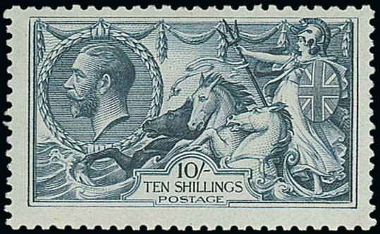 10/- dull grey-blue, large part original gum; good perforations. S.G. 417, £475. Photo