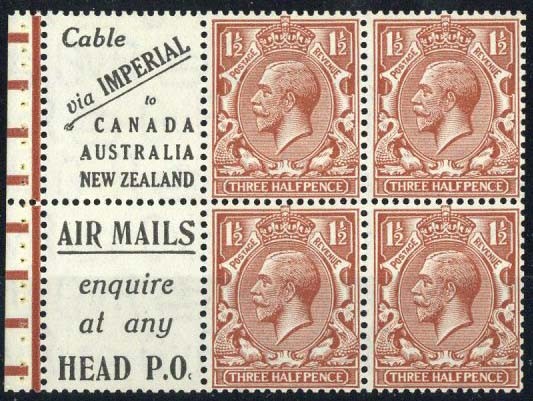 1½d. red-brown booklet pane with two printed labels, Cable via Imperial and Air Mails, unmounted mint; good perforations and perforated through the margin. S.G. NB15P (3)