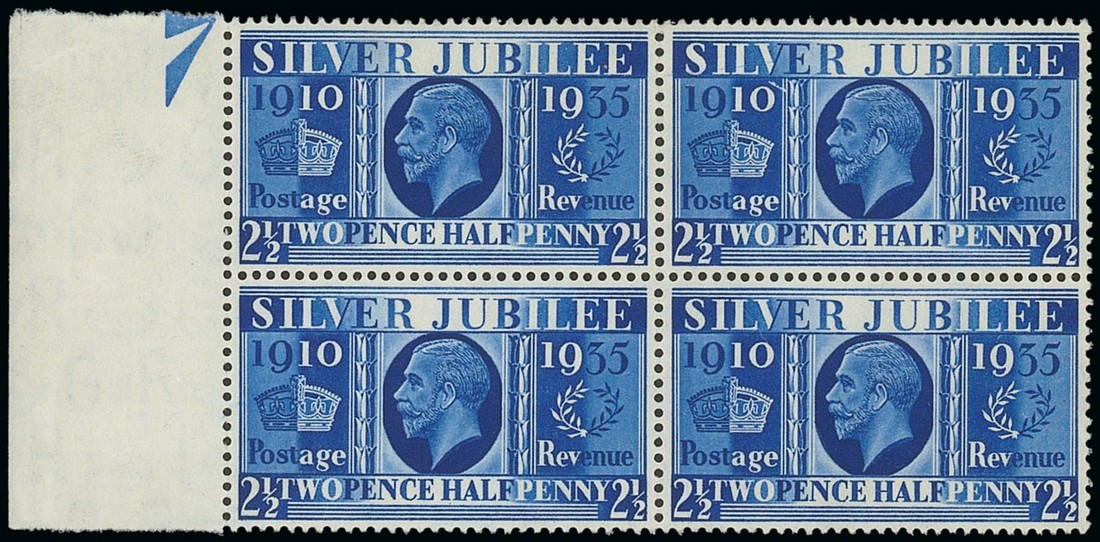 2½d. Prussian blue in a left margin block of four showing part of the margin arrow, large part original gum, the lower two stamps are unmounted mint; light vertical crease in the margin. A rare and highly desirable multiple of this very popular stamp. Very few multiples still exist today. B.P.A. Certificate (2007). S.G. 456a, £62,000+. Photo