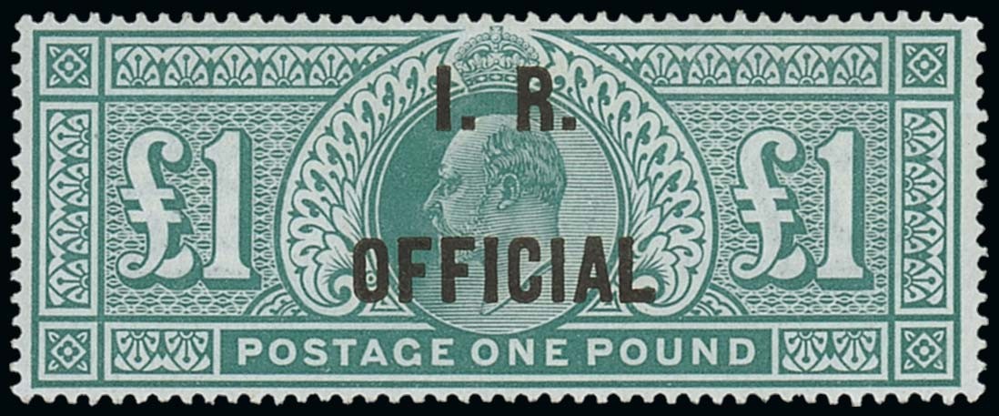 1902-04 £1 dull blue-green, large part original gum; light gum crease across top right corner. A very fresh and attractive example of this rarity. Outstanding appearance. B.P.A. Certificate (1934 and 2012). S.G. O27, £62,500. Photo