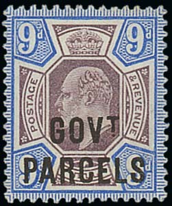 — 9d. dull purple and ultramarine, lightly mounted mint; fresh and fine. B.P.A. Certificate (1985). S.G. O77, £650. Photo