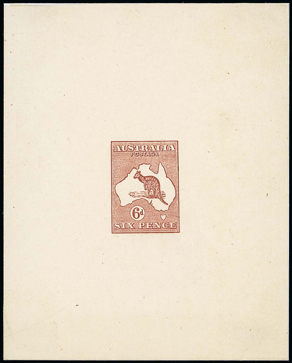 6d. red-brown die proof on unwatermarked white wove paper (180x100mm.), a superb impression, very fine. One of three recorded. BW 21DP(1) - not listed in this colour. Photo