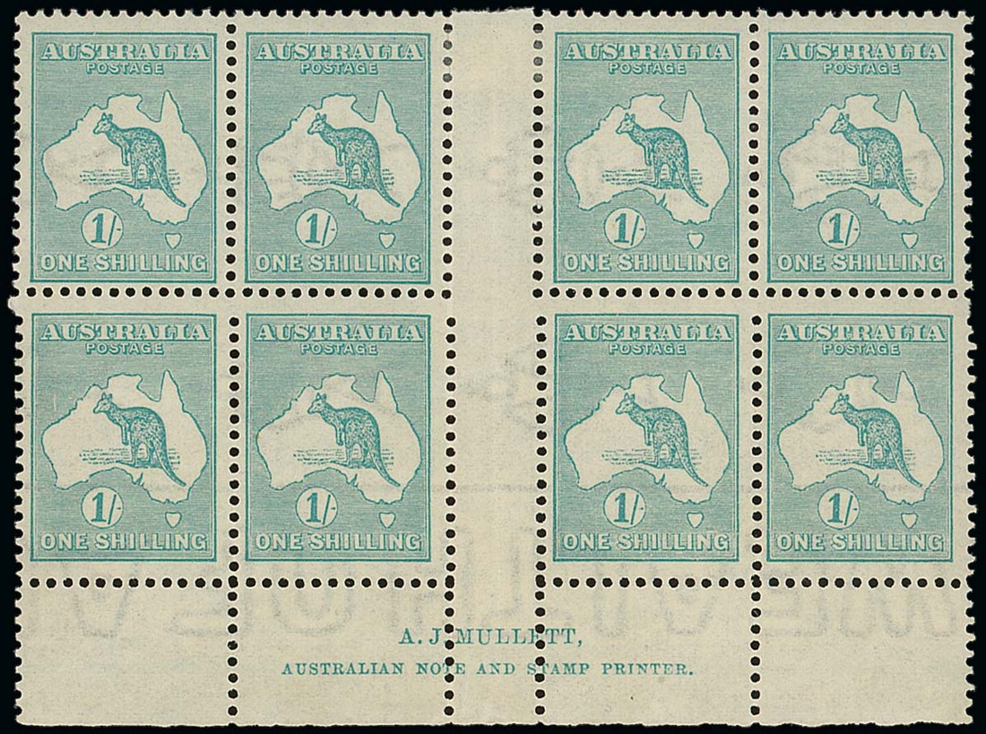 1/- blue-green, Die IIB, Plate 3, a Mullett imprint block of eight (4x2) with watermark sideways, fine mint. S.G. 40ba; BW 33(3)aa/zb, $2000+. Photo
