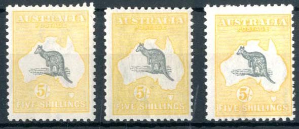 5/-, the three S.G. listed shades, one centred to lower right, fine mint. S.G. 42, 42a, 42b, £925; BW 44, $1200