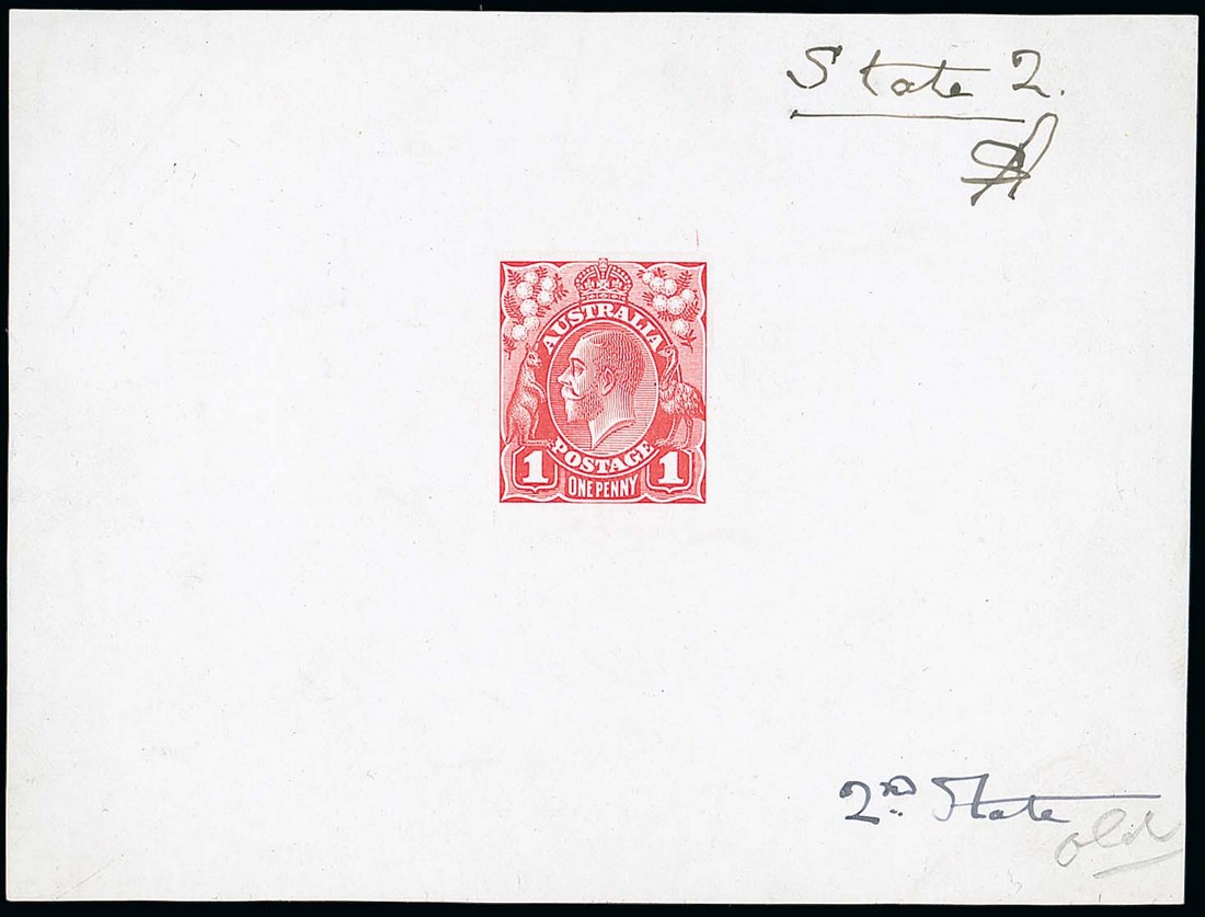 1d. State 2, head on lined background, in carmine-rose on thin glazed card (122x92mm.), marked "State 2" and initialled "SB" (Seymour Bennett of Somerset House). Two recorded. BW 70DP(12)Ca, $20,000. Photo