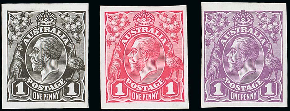 1d. in black, in carmine-rose and in mauve, singles of each on thin glazed card, fine. BW70PP(2)A/C/E, $600. Photo