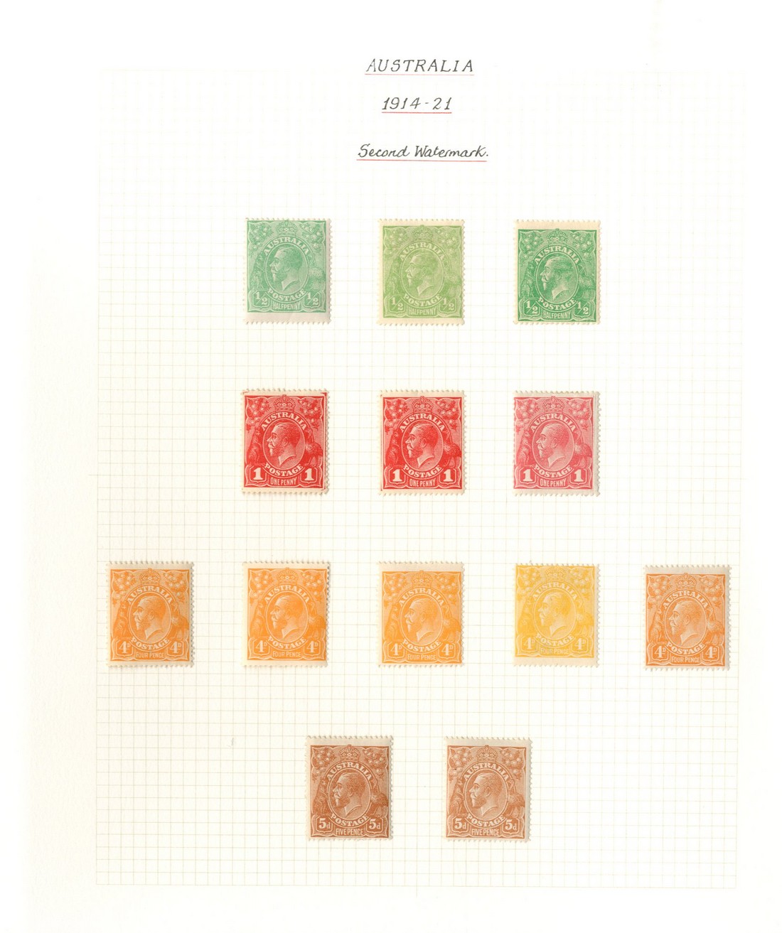 ½d. (5, two with watermark inverted), 1d. (3), 4d. (5, one a lemon-yellow shade) and 5d. (2), various shades, fine mint. S.G. 20-23, £400 approx.