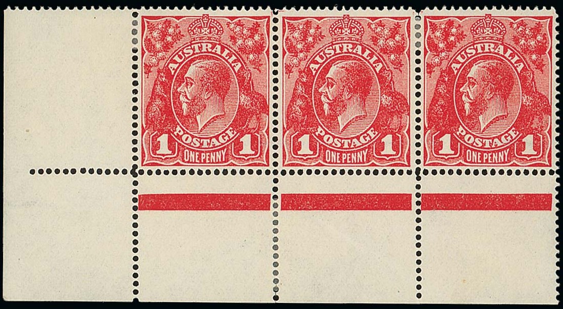 1d. carmine-red, line perf 14¼, a no monogram lower left corner strip of three, fine mint. S.G. 21; BW 70(4)z, $1250. Photo