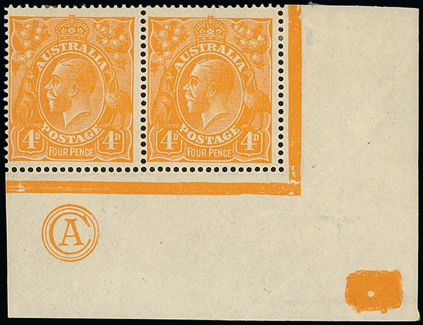 4d. yellow-orange, Plate 2, a lower right corner pair with "CA" monogram, some hinge remnants and small thin in selvedge at right, fine appearance and colour. B.P.A. Certificate (2011). S.G. 22a; BW 110B(2)zb, £1000. Photo