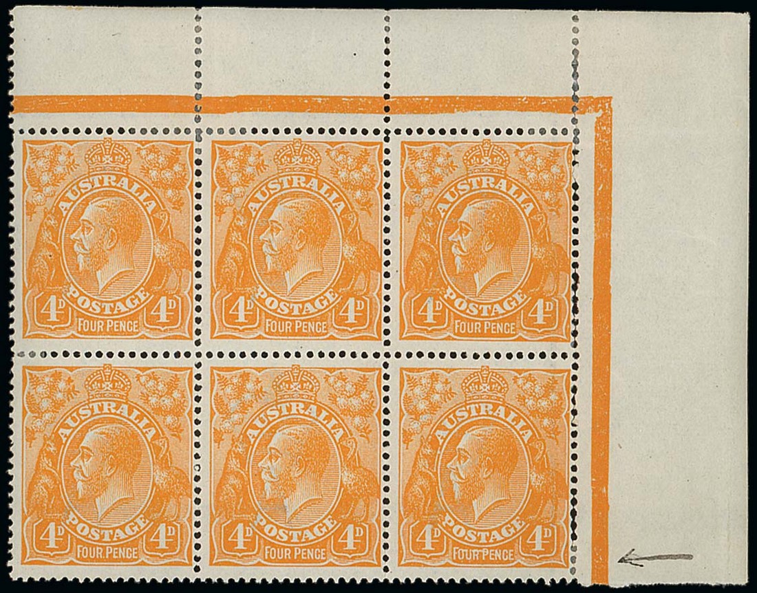 4d. buff-orange, a top right corner block of six (3x2), the lower right stamp showing line through "fourpence", a few split perfs and some minor marginal creasing otherwise fine mint. S.G. 22e, £325+; BW 110F/h, $1000. Photo