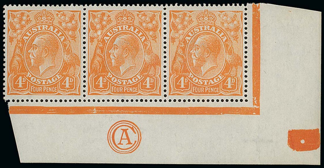 4d. buff-orange, Plate 2, a lower right corner strip of three with "CA" monogram, fresh and fine mint, mounted in the selvedge only. Sydney PRS Certificate (2006). BW 110F(2)zb, $1500. Photo