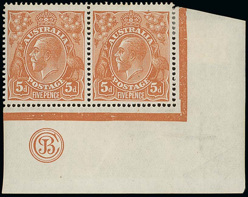 5d. chestnut, comb perf, a lower right corner pair with "JBC" monogram, a little gum toned, fine mint. S.G. 23b; BW 123Az, $1000. Photo