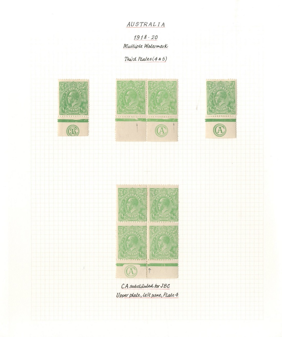 ½d green mint study, comprising blocks of fifteen, six and four (13), pairs (6) and singles (23) including various plate flaws including dot after right "2", eight wattles at left, thin fraction at right and "neckless" emu, watermark inverted (2), singles with "JBC" and "CA" monograms and a block of four with "CA" monogram substituted for "JBC". A fine lot. S.G. 48 group; BW 65 group