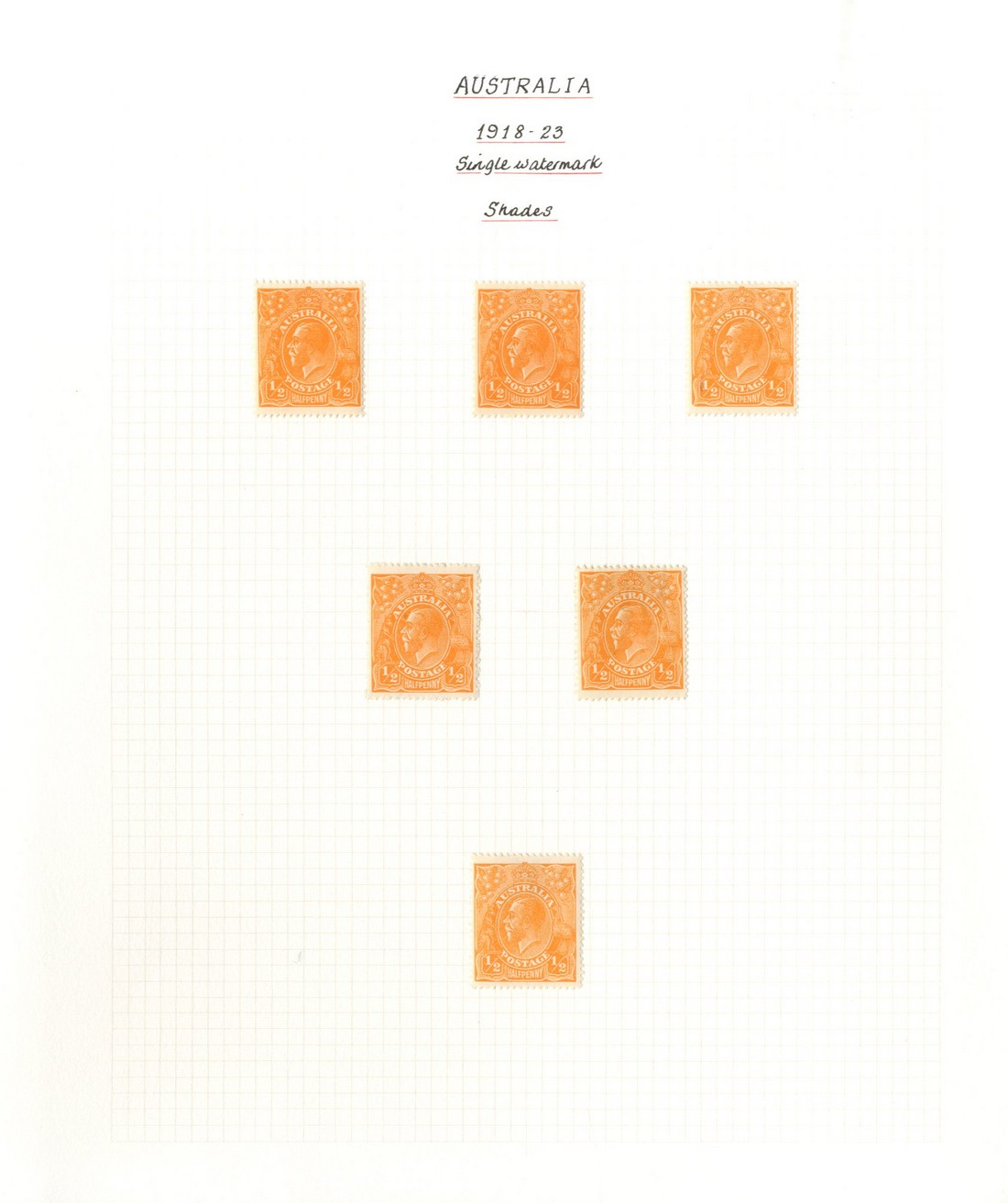 ½d. orange (shades), a neatly mounted and written-up mint study comprising blocks of fifteen (2, both with watermark inverted), twelve (watermark inverted) and four (14, six with watermark inverted and one with Harrison imprint), strips of four (watermark inverted) and three, pairs (5, two with Harrison imprint) and singles (22), many with plate flaws. A fine lot. S.G. 56; BW 66, $1800+