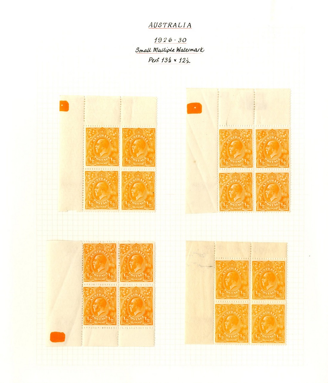 ½d. orange (shades) mint range neatly mounted and written-up, comprising blocks of nine (2), eight with imprint and four (13, three with imprint and four are corner), pairs (2) and singles (10), many with plate flaws identified, fine. S.G. 94; BW 68