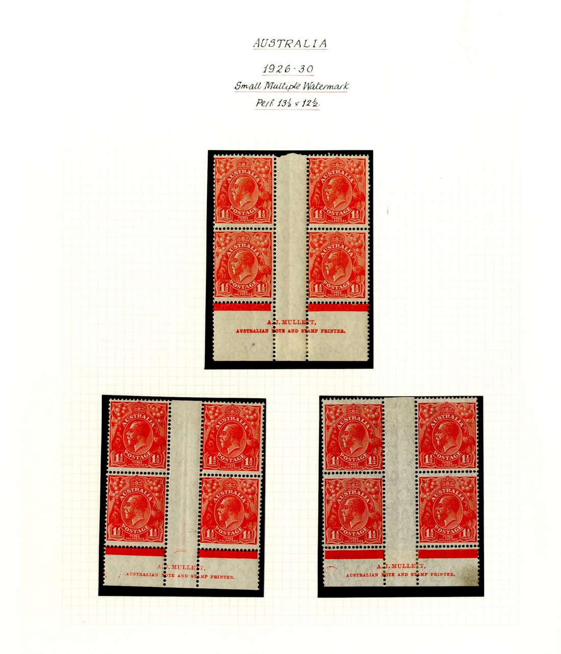 1½d. scarlet (shades) mint group neatly mounted and written-up, comprising corner blocks of four with plate dots (4), imprint blocks of four (4), imprint strip of four, blocks of four (4), imprint pairs (2), corner pairs with plate dots (7) and singles (12, one with double perf and one with offset), a few with plate flaws identified, fine. S.G. 96; BW 92
