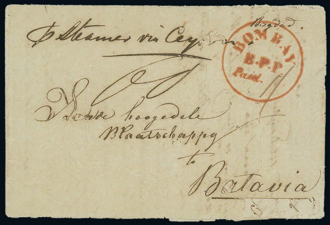 1847 (27 Jan.) entire letter from Baghdad "p Steamer via Ceylon" to Batavia and written inside as via Beirut, Alexandria and Bombay, disinfected with slits and showing fine "bombay/b.p.p./Paid." handstamp on face; small faults though an unusual item carried by the Dromedary Post which operated over the Syrian Desert from Baghdad to Beirut between 1843 and 1886. Photo