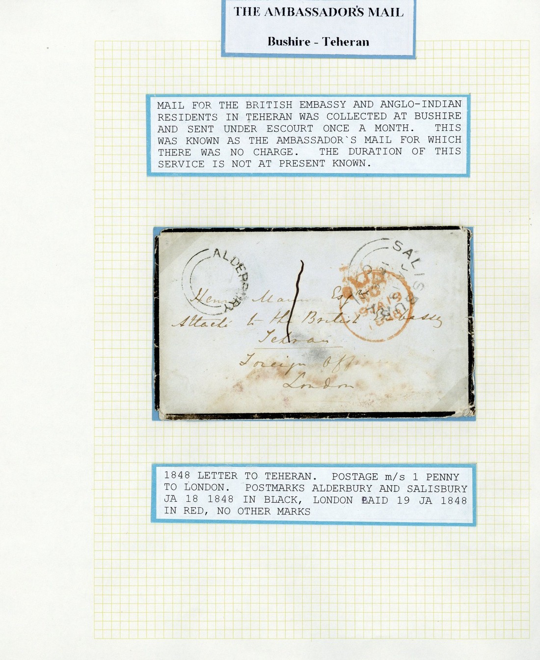 1848 (18 Jan.) mourning envelope (some splits at edges), complete with four page letter, from Edward Mann at Alderbury to his brother "Attaché to the British Embassy Tehran" and sent care of the Foreign Office in London, showing manuscript "1" for internal postage, despatch undated circle, Salisbury and London datestamps. Most unusual