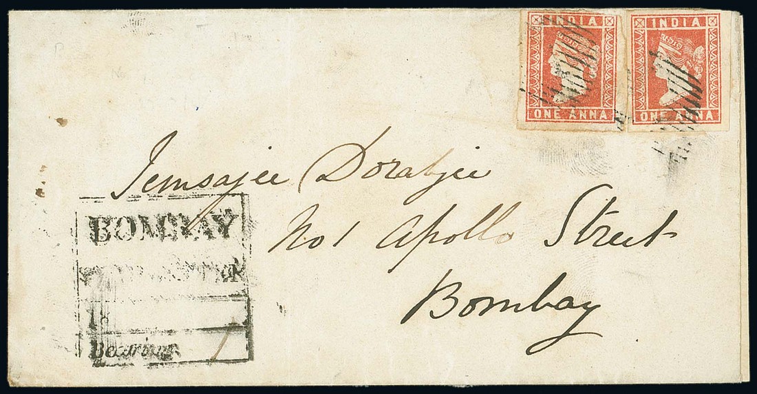 1858 (27 Sept.) envelope to Bombay complete with request note marked "Bushire" for forwarding of letter if addressee not found in Bombay, bearing 1854 1a. red Die II (2) both cancelled "1" in diamond of bars and with Bombay Ship Letter Bearing handstamp at lower left corner, arrival c.d.s. (2.11) on reverse. An unusual item of mail from the rear guard serviced in India. Also 1857 part entire to Bushire bearing 1854 1a. red Die II (2) and 4a. 4th. printing all cancelled by diamond of bars. Photo